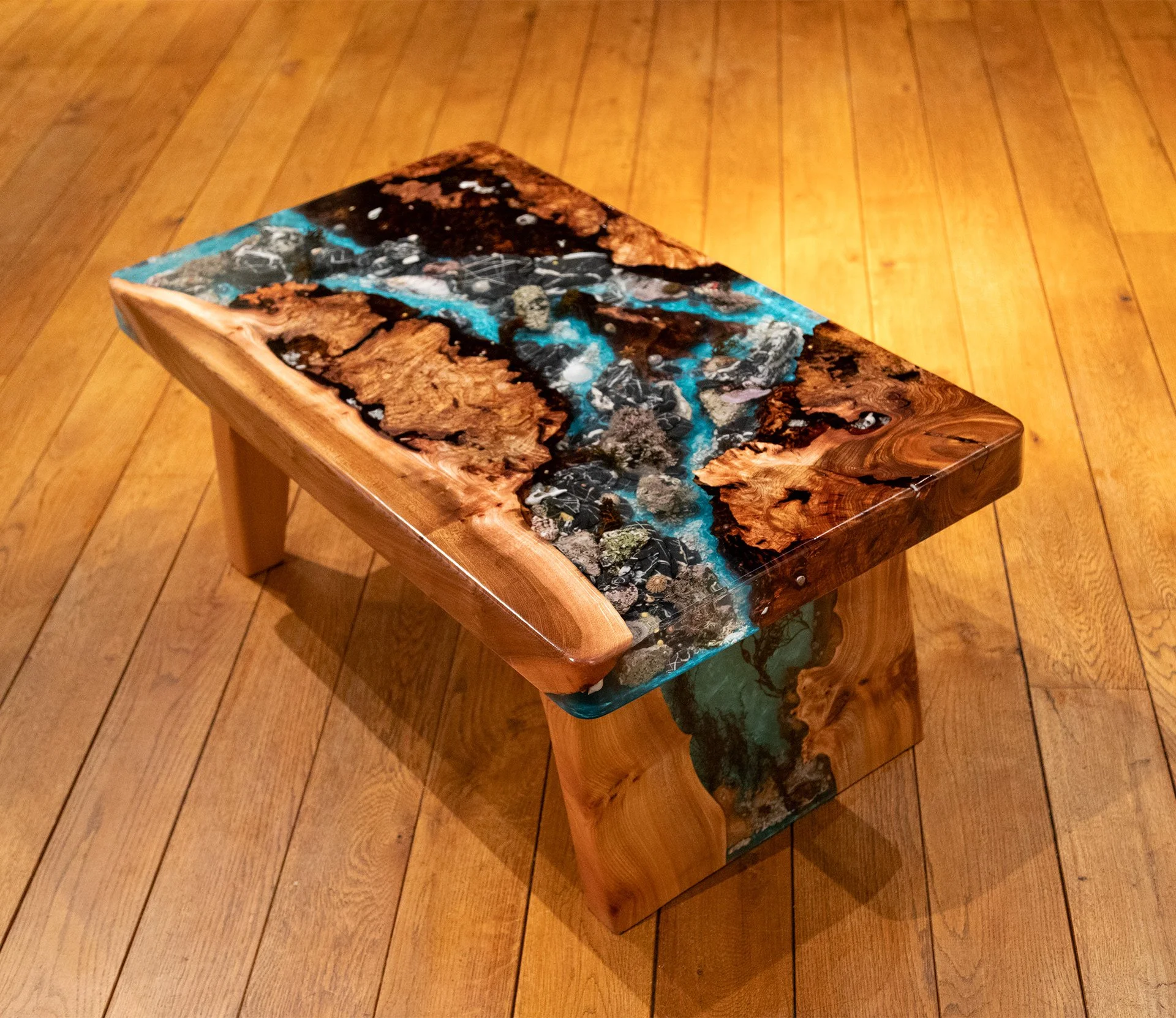 A wooden table with a glossy resin river design blending natural wood and blue resin to resemble water.